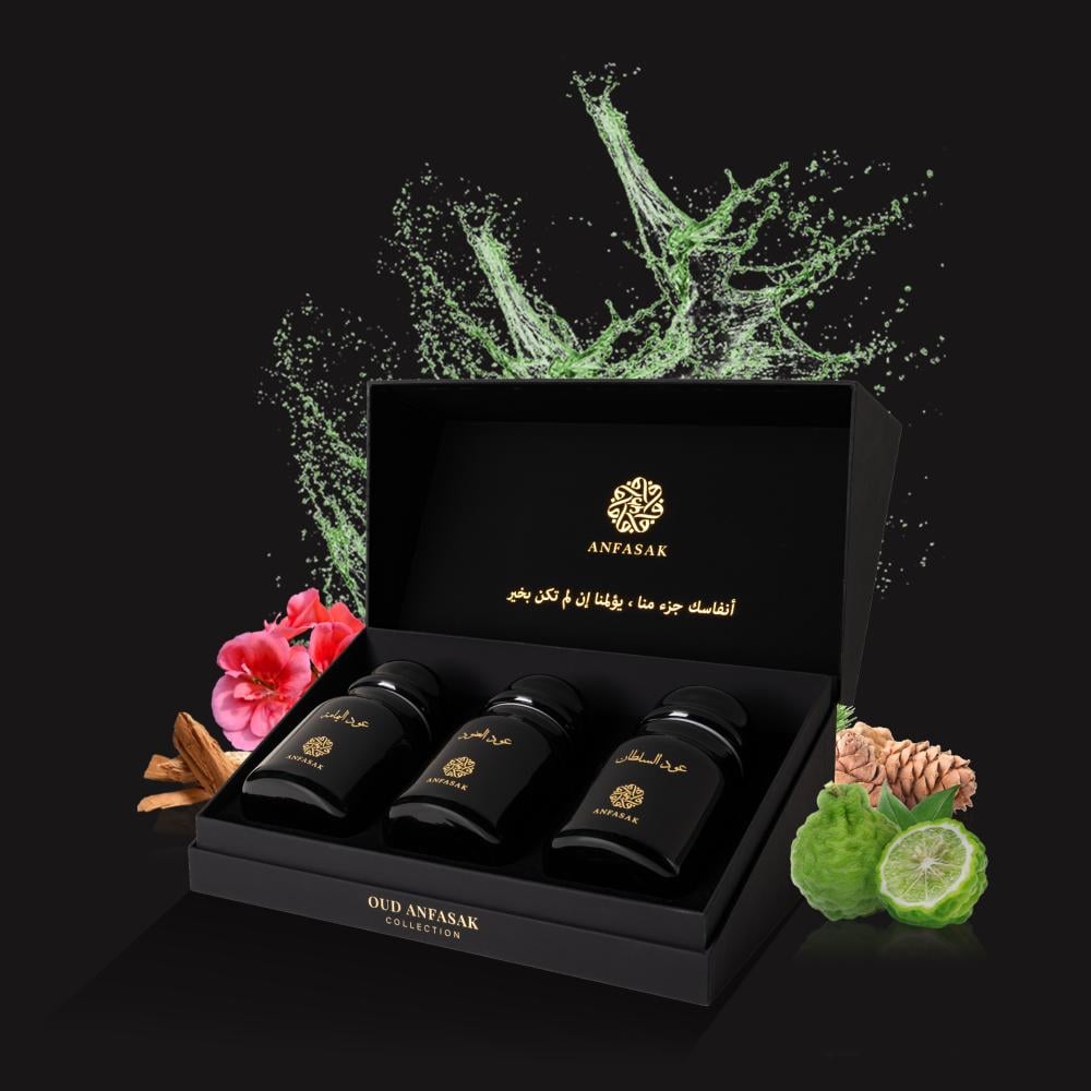 منتج عود انفاسك يضم 3 انواع من عود التراد الطبيعي الممزوج بزيوت عطريه فاخرة ، يصل وزن مجموع العود 225 جرام ما ياقارب ربع كيلو لكل نوع 75 جرام